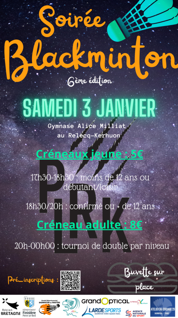 Le PLRK Badminton vous invite à la 6ᵉ édition de sa soirée Blackminton le samedi 3 janvier au gymnase Alice Milliat au Relecq-Kerhuon.